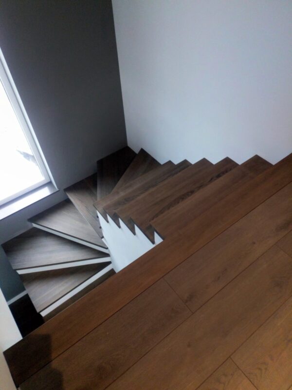 Uosio masyvo pakopos su „falš” pakopa viršuje. Viršutinės grindų dalies užbaigimo būdai yra trys: medinis kampas, aliuminio kampas arba mūsų vadinama „falš” pakopa. Mūsų nuomone paskutinis užbaigimo būdas gražiausiai atrodo vidaus interjere.