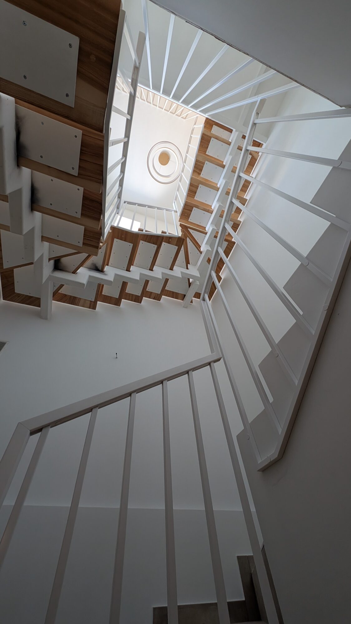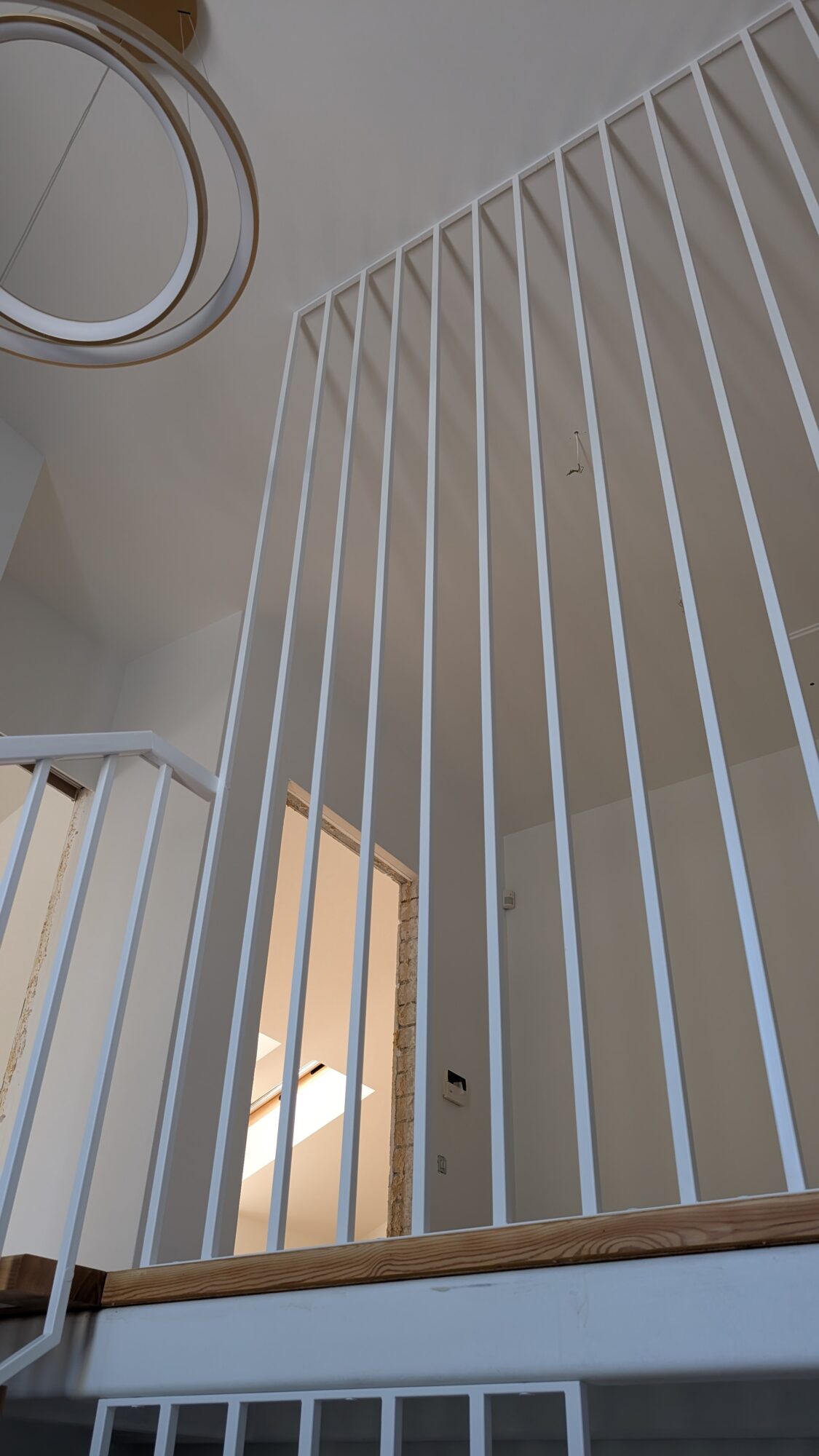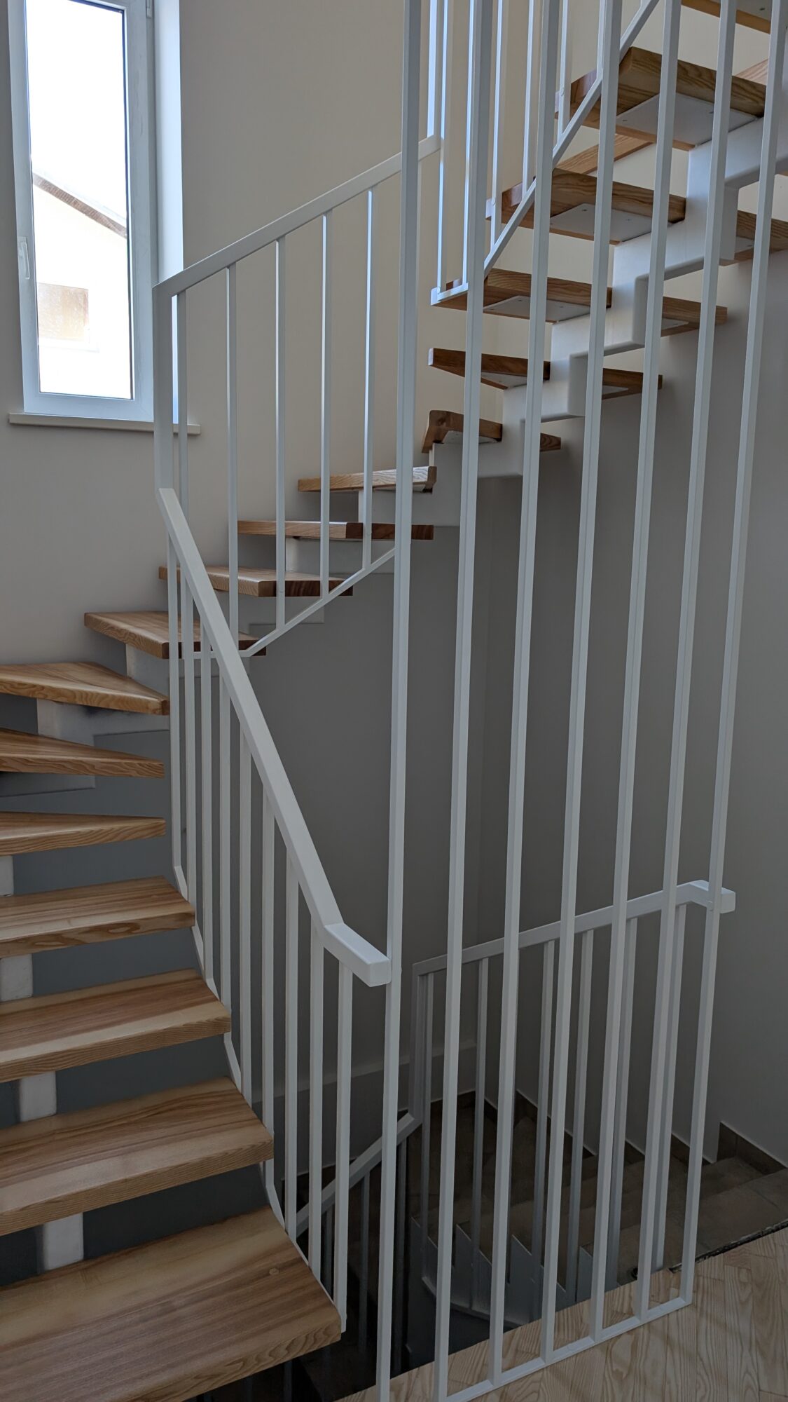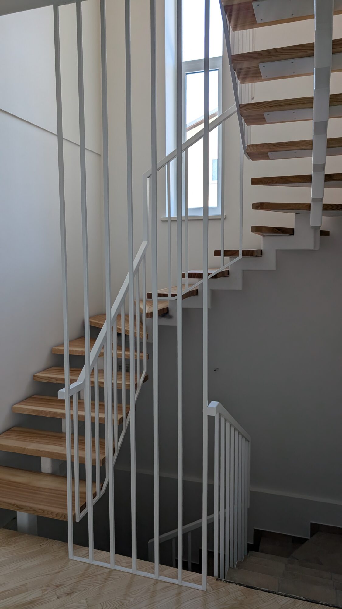 Metaliniai turėklai su baltai dažytu mediniu porankiu per tris aukštus. Baltas dažytas porankis suteikia konstrukcijai vientisumo ir lengvumo. Papildomai šiame projekte atnaujinome senas laiptų pakopas, perlakavome ir sumontavimo atgal.