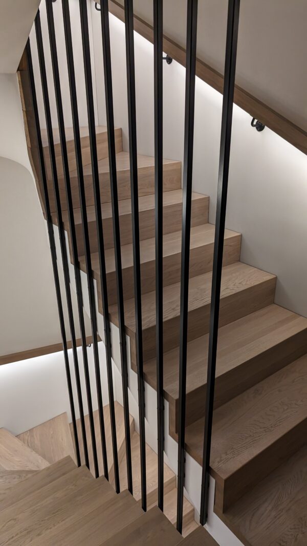 Vientisi turėklas per tris aukštus iš kvadratinių profilių. Šiame objekte klientas pageidavo neapkrauti laiptų pakopų papildomai elementais, pasimatavę laiptų tarpą pasiūlėme turėklus tvirtinti prie šono. Turėklą trečiame aukšte užbaigėme ąžuolo masyvo porankiu.