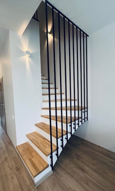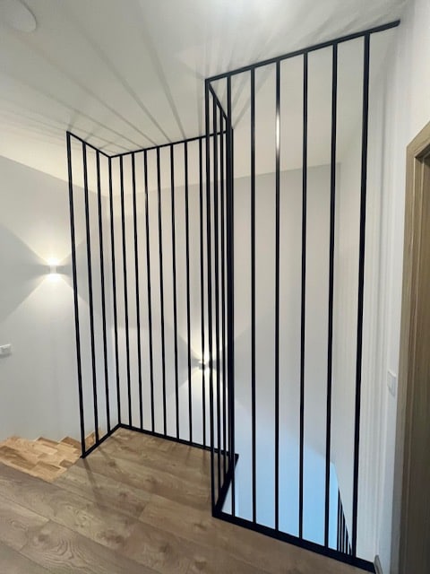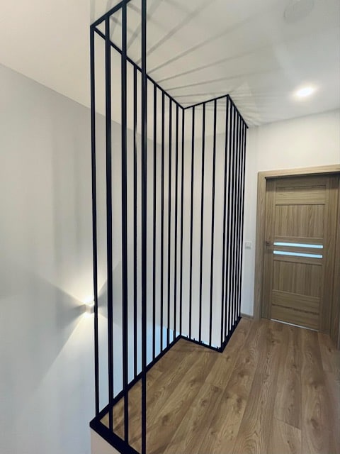 Metaliniai vidaus turėklai iš kvadratinių profilių. Šio objekto išskirtinumas antro aukšto turėklas apatinėje dalyje pritvirtintas per metalo kampą, taip uždengiant grindų nelygumus.