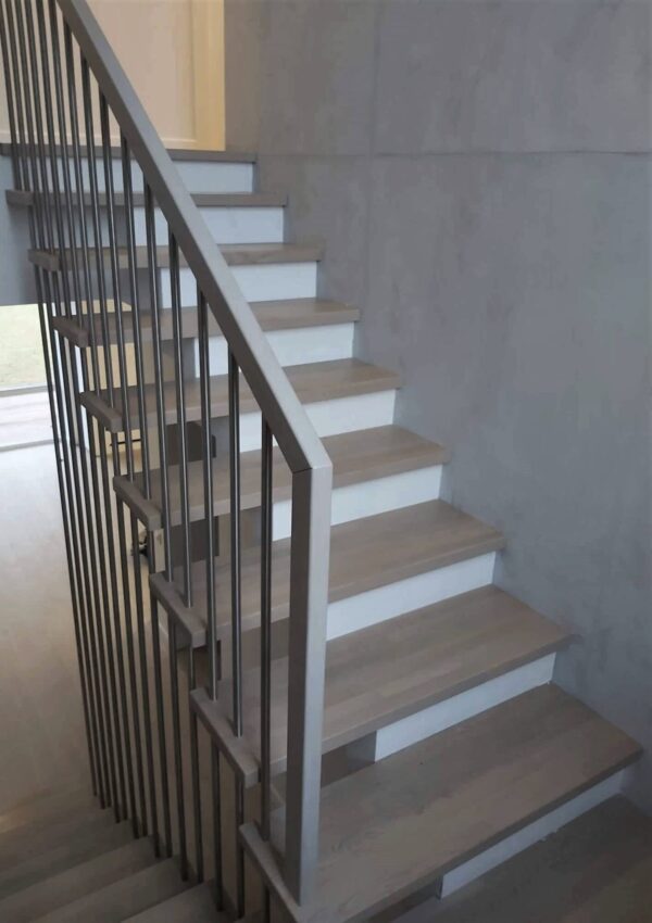 Turėklai per du aukštus iš nerūdijančio plieno. Dizainerė paprašė išsaugoti kuo daugiau laiptų ploto, todėl nusprendėme vidaus turėklų detales tvirtinti kiaurai pakopas. Porankis padengtas beicu pagal laiptų pakopas.