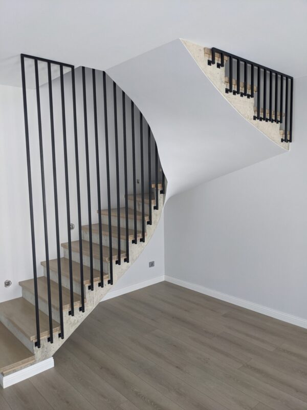 Turėklai iš metalo per du aukštus. Konstrukcija pagaminta iš kvadratinių turėklų detalių, viskas nudažyta milteliniu būdu juoda matine spalva.
