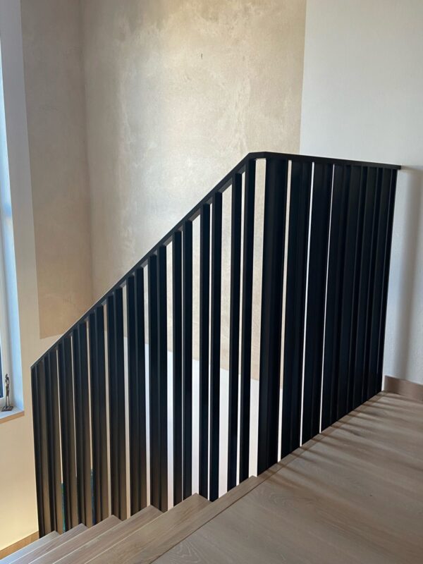 Metaliniai vidaus turėklai iš stačiakampių metalinių profilių. Šiame objekte perdarėme kolegų nekokybiškai pagamintus turėklus. Panaudojome šiek tiek platesnį profilį, tam kad turėklų detalės neišsilenktų kai jas virinome. Visur naudojamas preciziniai juodo plieno vamzdžiai.