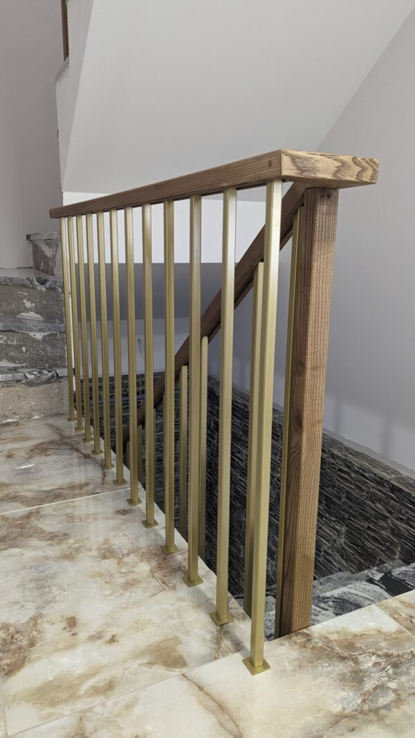 Aukso spalva dažyti klasikiniai turėklai. Visi laiptų turėklų elementai yra kvadratiniai. Vidaus turėklų apačioje yra dekoratyviniai dangteliai kurie suteikia turėklams prabangos.