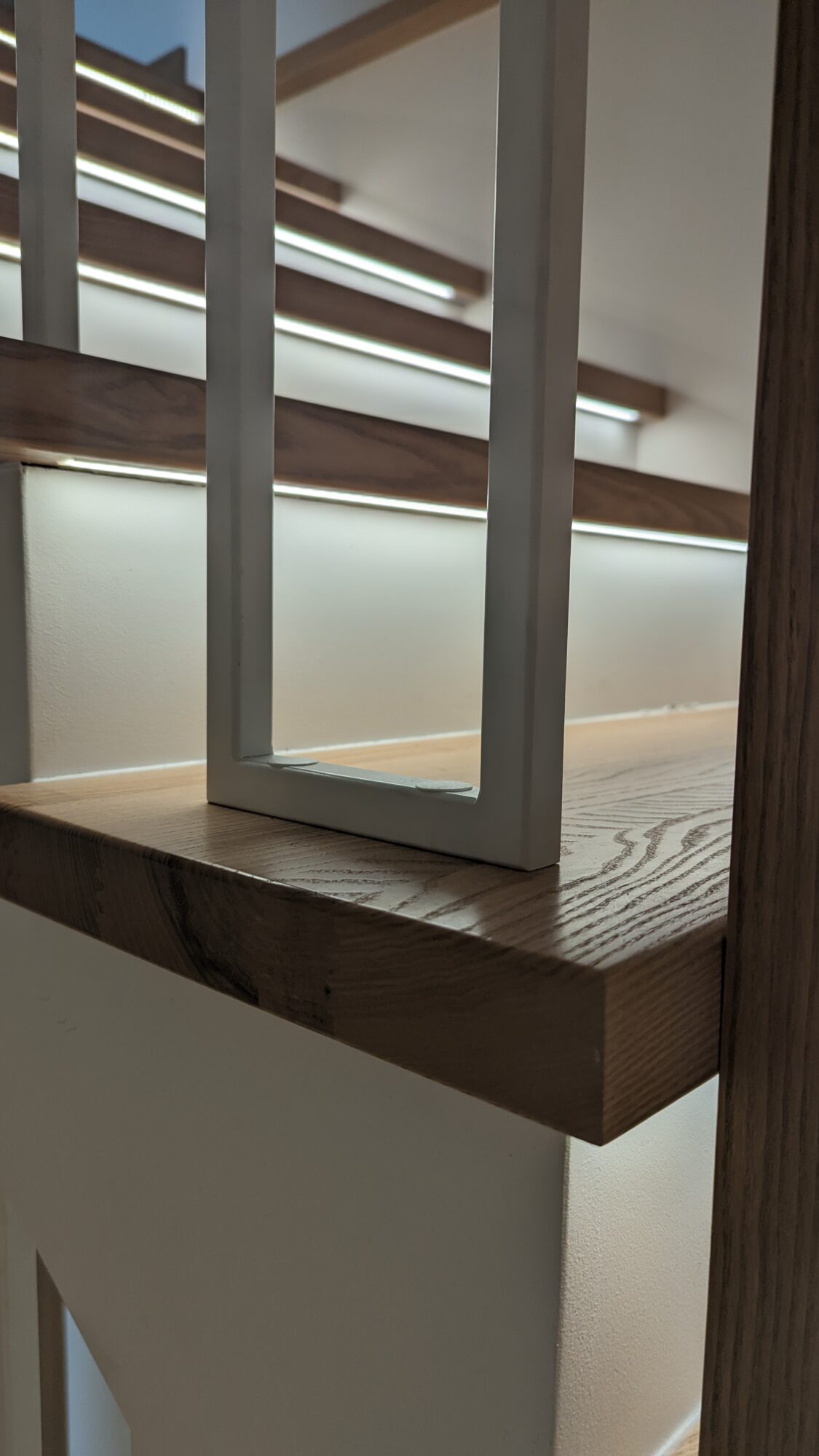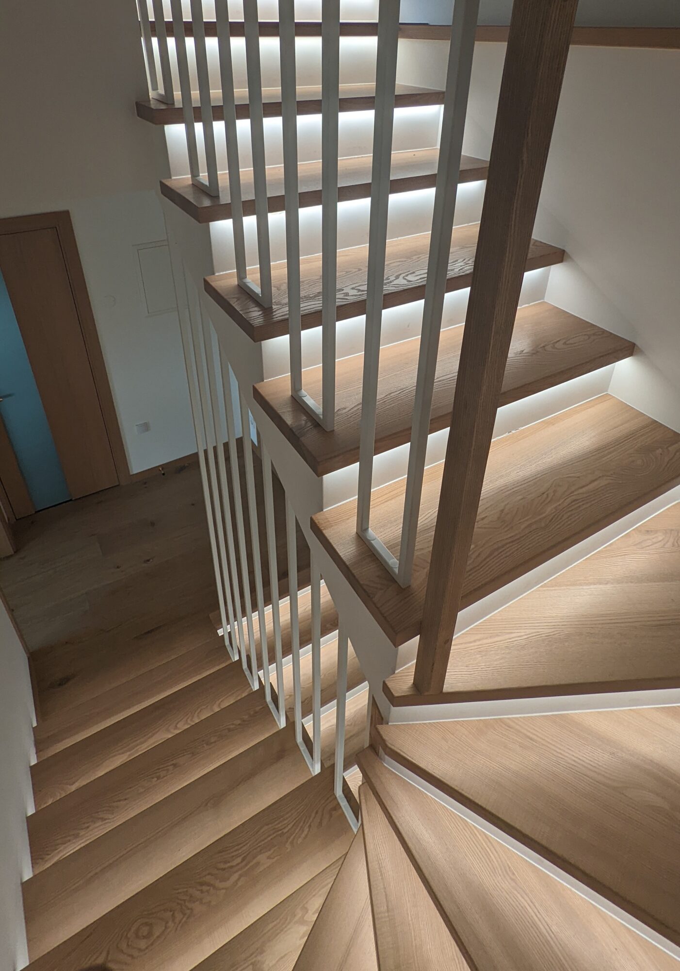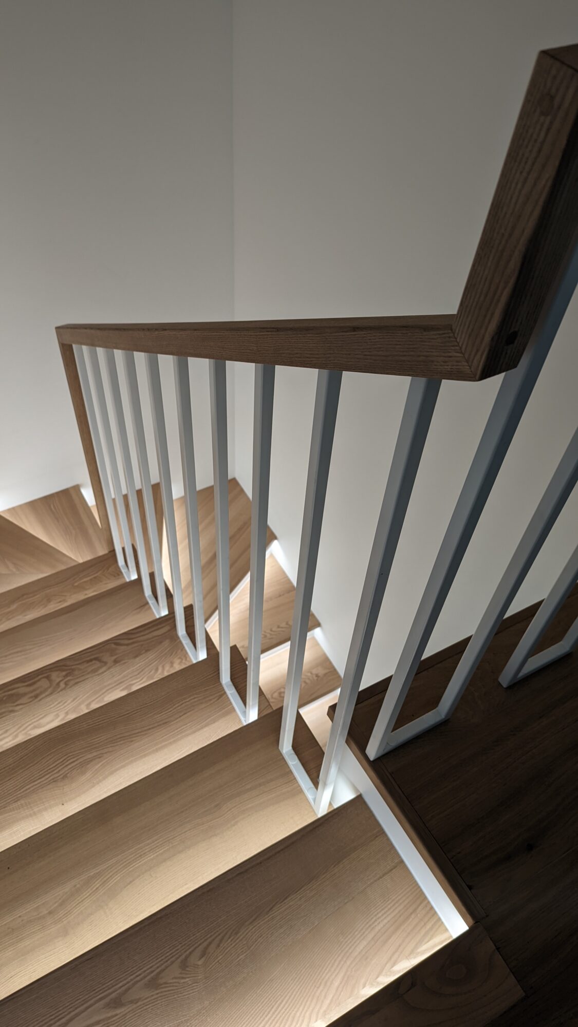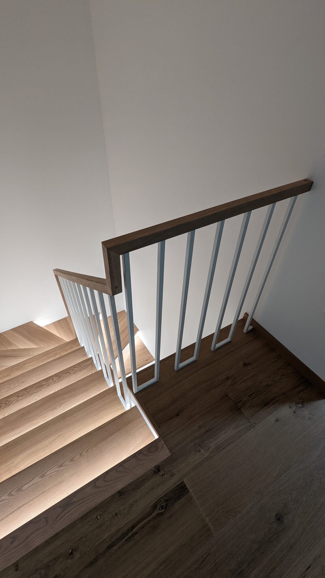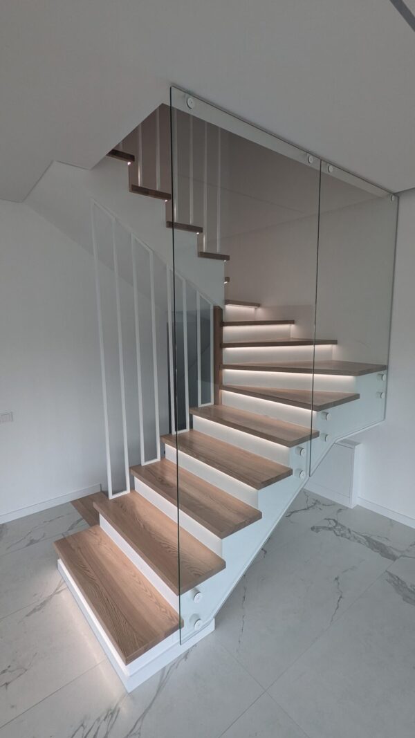 Metalo ir stiklo turėklai per tris aukštus. Norint neapkrauti svetainės metalais klientui pasiūlėme vieną dalį turėklų daryti iš stiklo. Stiklas 10 mm grūdintas skaidrus. Porankio spalva parinkta pagal pakopų spalvą.