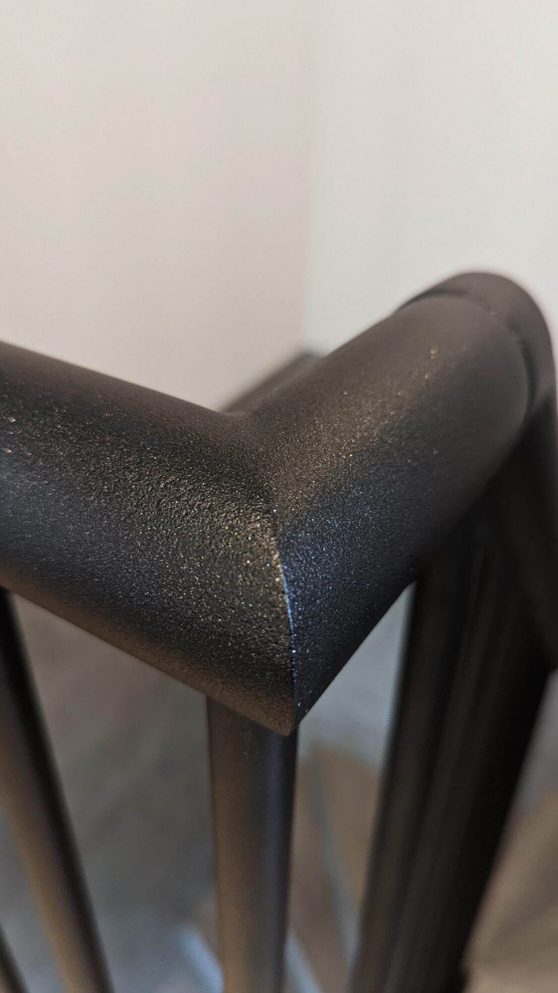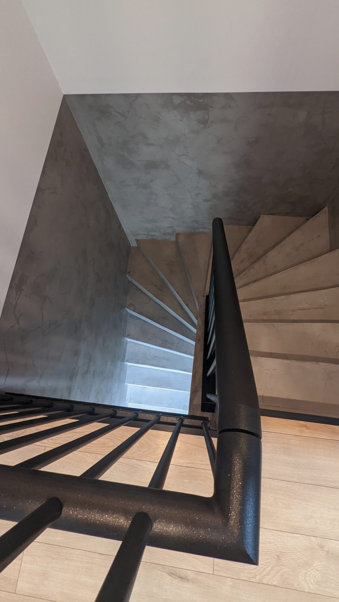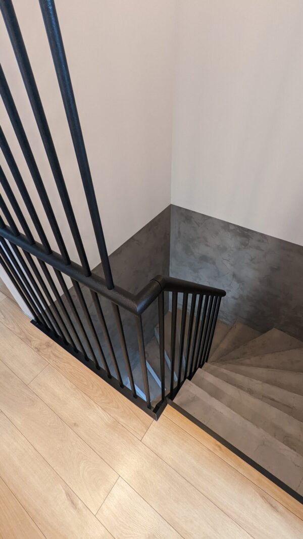 Metaliniai turėklai iš apvalių profilių. Klientė pageidavo, kad visur būtų panaudoti apvalūs profiliai – norus išpildėme. Turėklų spalvą parinkome pagal namie jau esančias kitas dažytas metalines konstrukcijas.