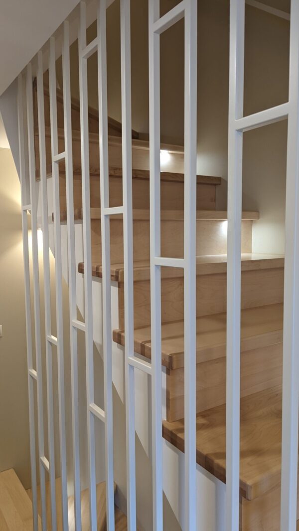 Plieniniai turėklai per du aukštus su horizontaliu chaotišku išdėstymu. Tokio tipo tvorelę galima naudoti kaip atramą, nes papildomai yra privirinti horizontalūs intarpai. Porankis prie sienos iš stačiakampio profilio, tvirtinimo elementas mūsų pačiu pagaminta apgaubianti detalė. Turėklai milteliniu būdu išdažyti RAL9003 balta matine spalva.