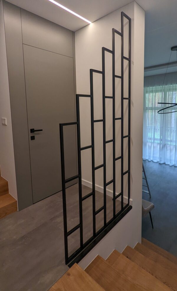 Juodi turėklai iš kvadratinio profilio. Kliento pageidavimu neuždarėme pilnai erdės, turėklo elementų išdėstymą derino su brėžiniais, tik juos patvirtinus gaminome.