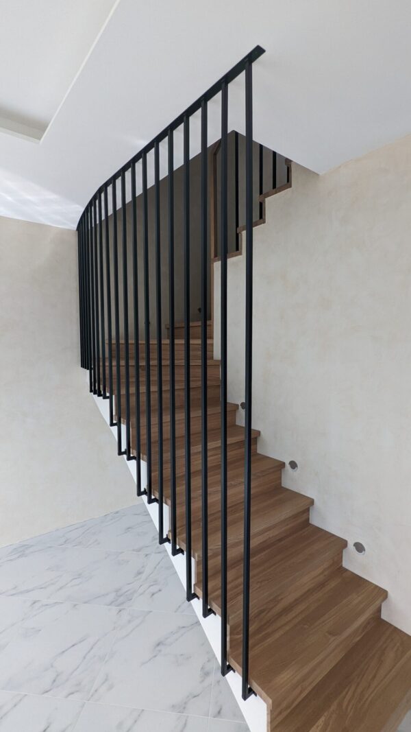 Turėklas per du aukštus ant suktos laiptasijos. Toks laiptų tipas, kai betoninė laipto dalis sukasi į šoną yra pakankamai retas reiškinys šiuolaikinėje statyboje. Mūsų pasiūlytas sprendimas buvo turėklus daryti iki lubų. Tvirtinimas iš šono su papildomomis dekoratyvinėmis detalėmis.