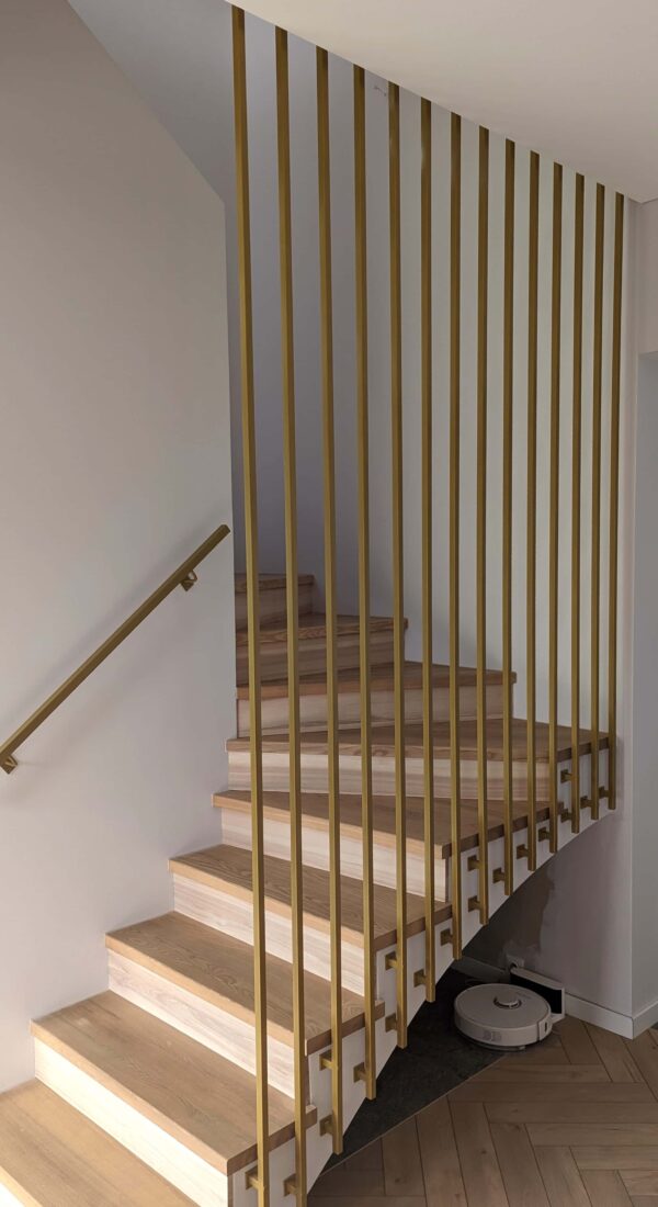 Turėklai iš plieno dažyto aukso spalva. Galime pasiūlyti didelį spalvų asortimentą, šiame projekte turėklai buvo gaminami iš precizinio ėsdinto plieno dažomi aukso spalva.