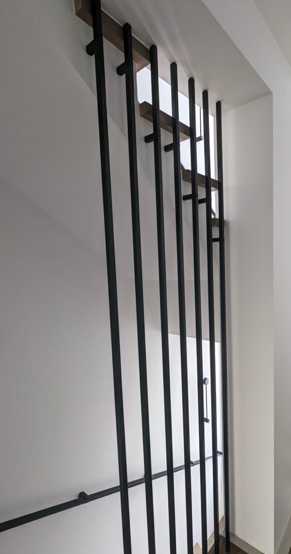 Vidaus metaliniai turėklai. Porankis pagaminta iš stačiakampio profilio su išskirtiniais tvirtinimo elementais, kurie suteikia turėklui išskirtinumo. Laiptų turėklų tvorelė per du aukštus iš kvadratinio profilio. Visos metalinės konstrukcijos nudažytos juoda matine spalva.