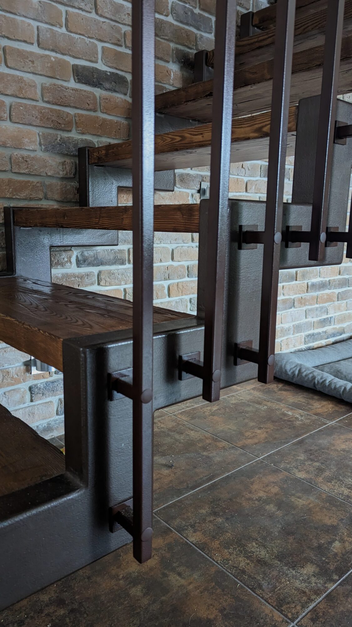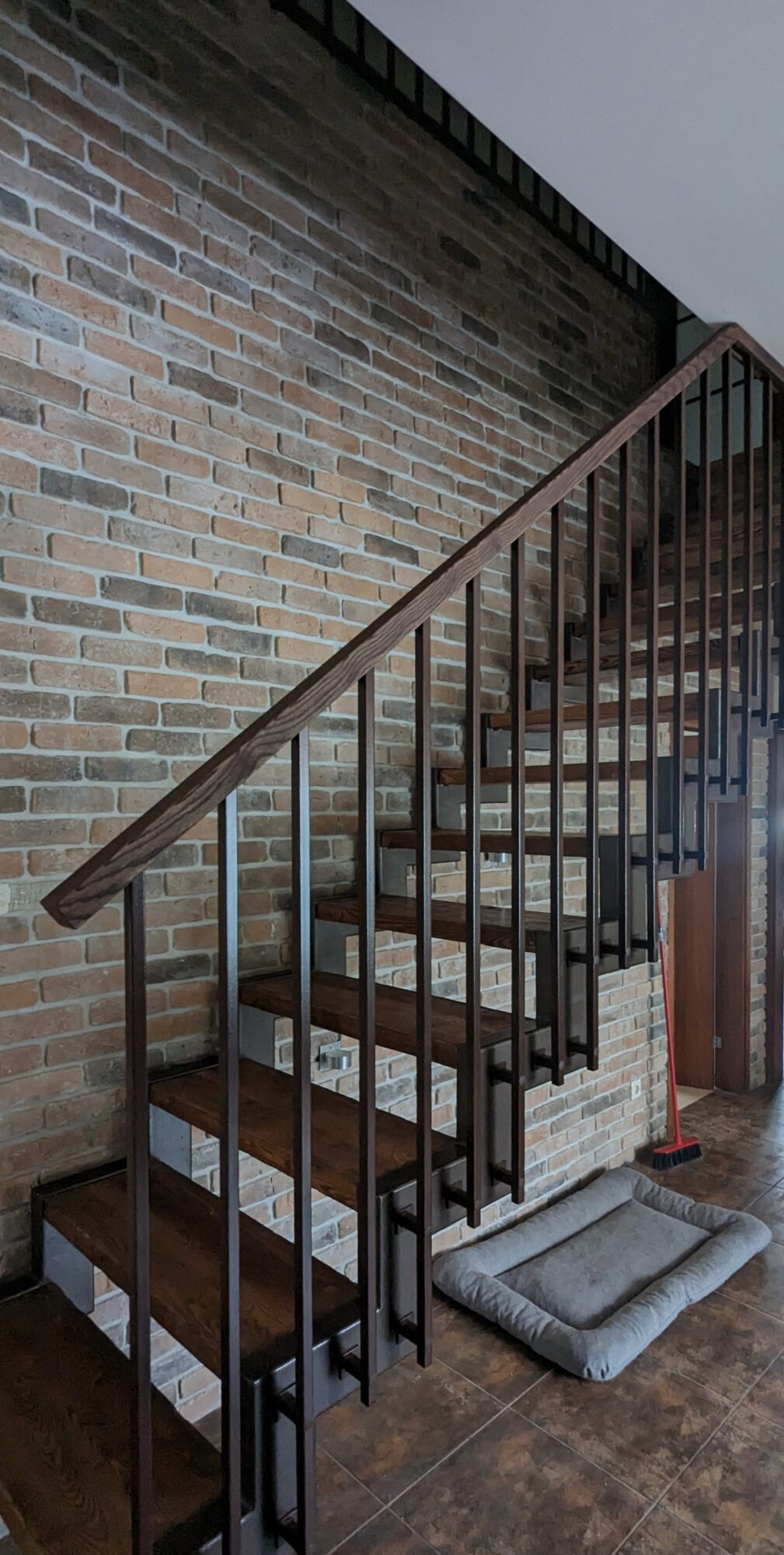 Turėklai laiptams. Antrame aukšte ant suformuotos sienutės sumontavimo kvadratinius vamzdelius ir porankį, spalvas derinome prie jau prieš tai pagamintos laiptasijos ir laiptų pakopų. Pirmame aukšte tvirtinimui pasirinkome vamzdelių prisukimą į laiptasijos šoną.