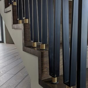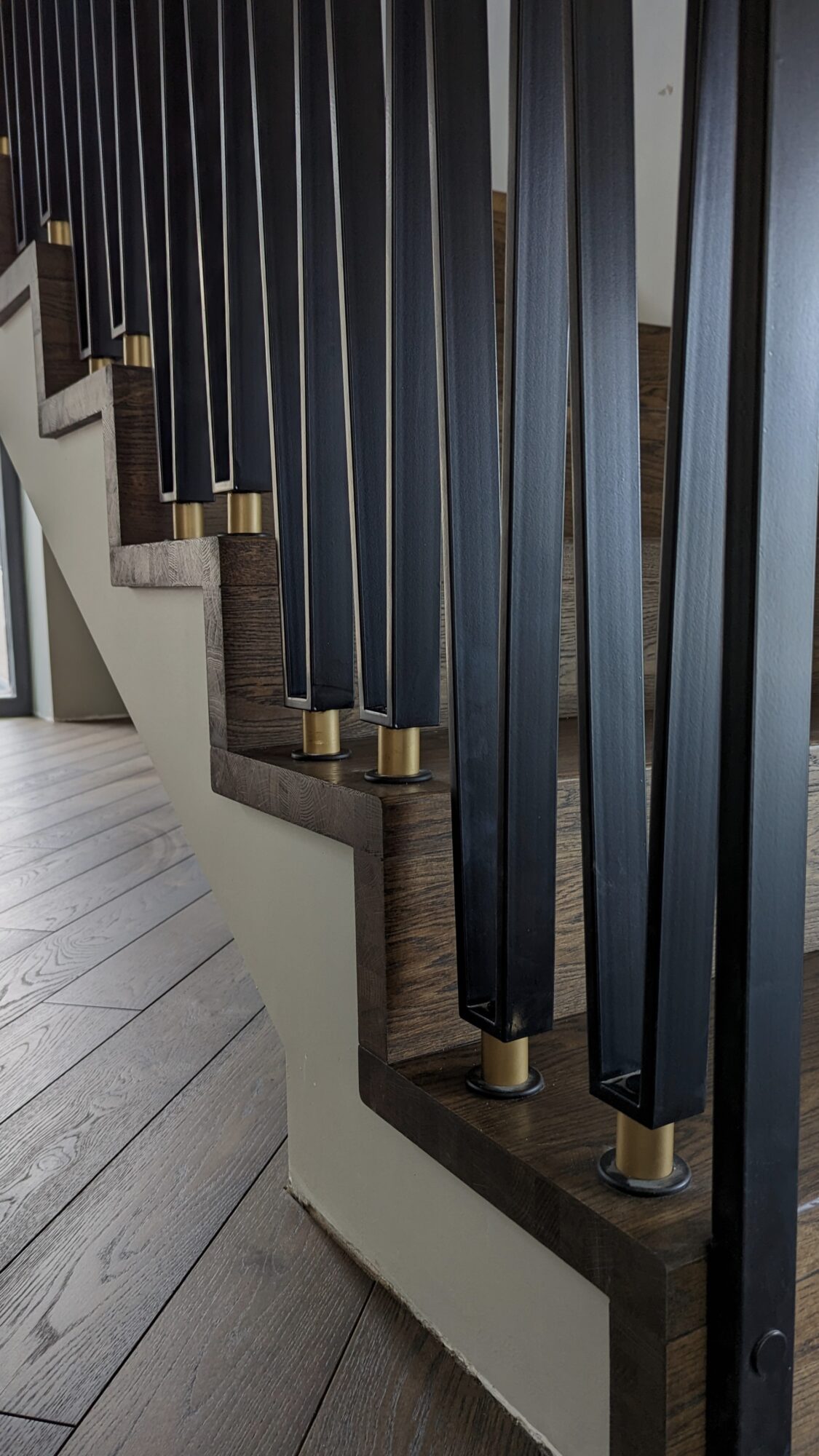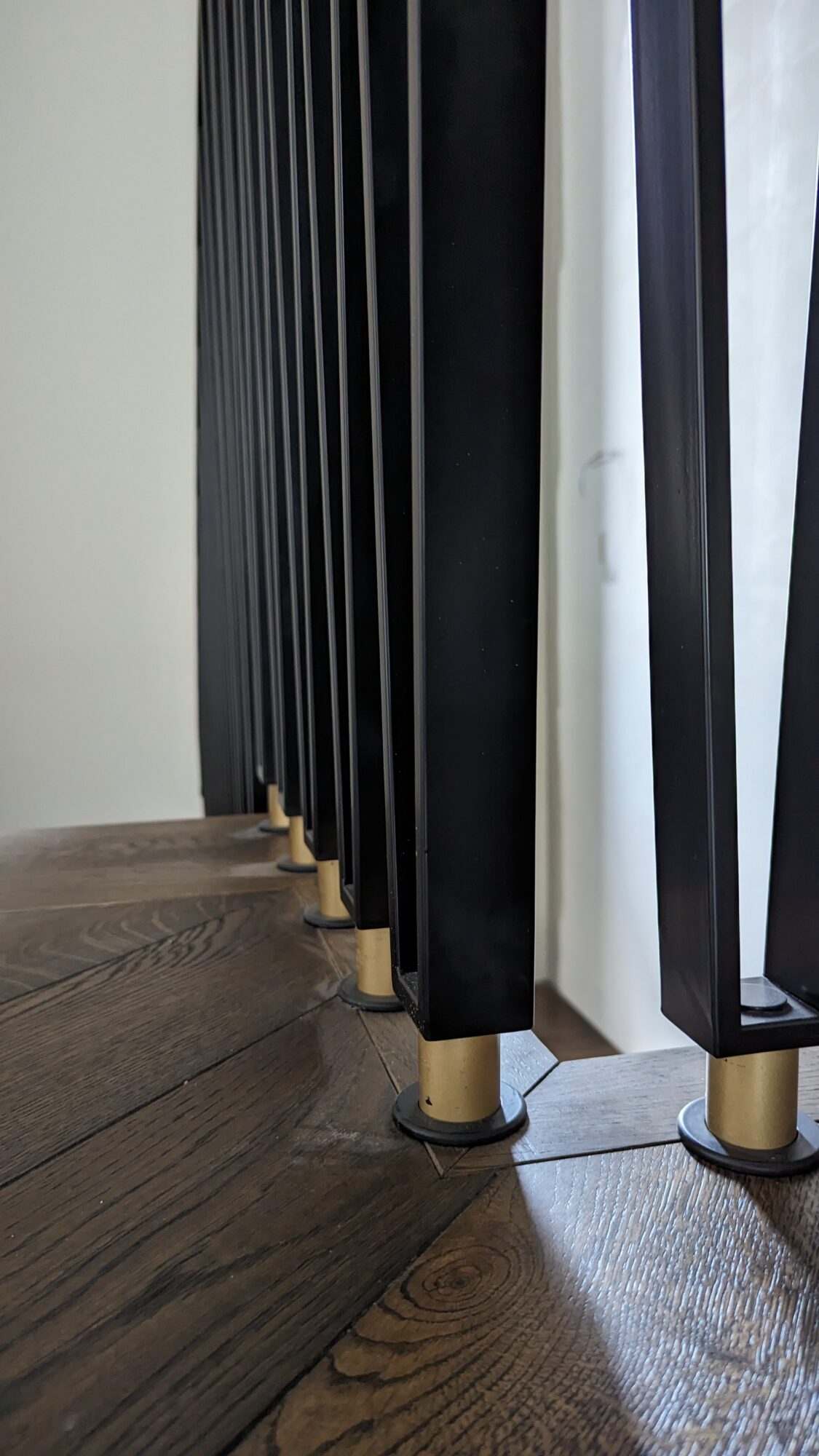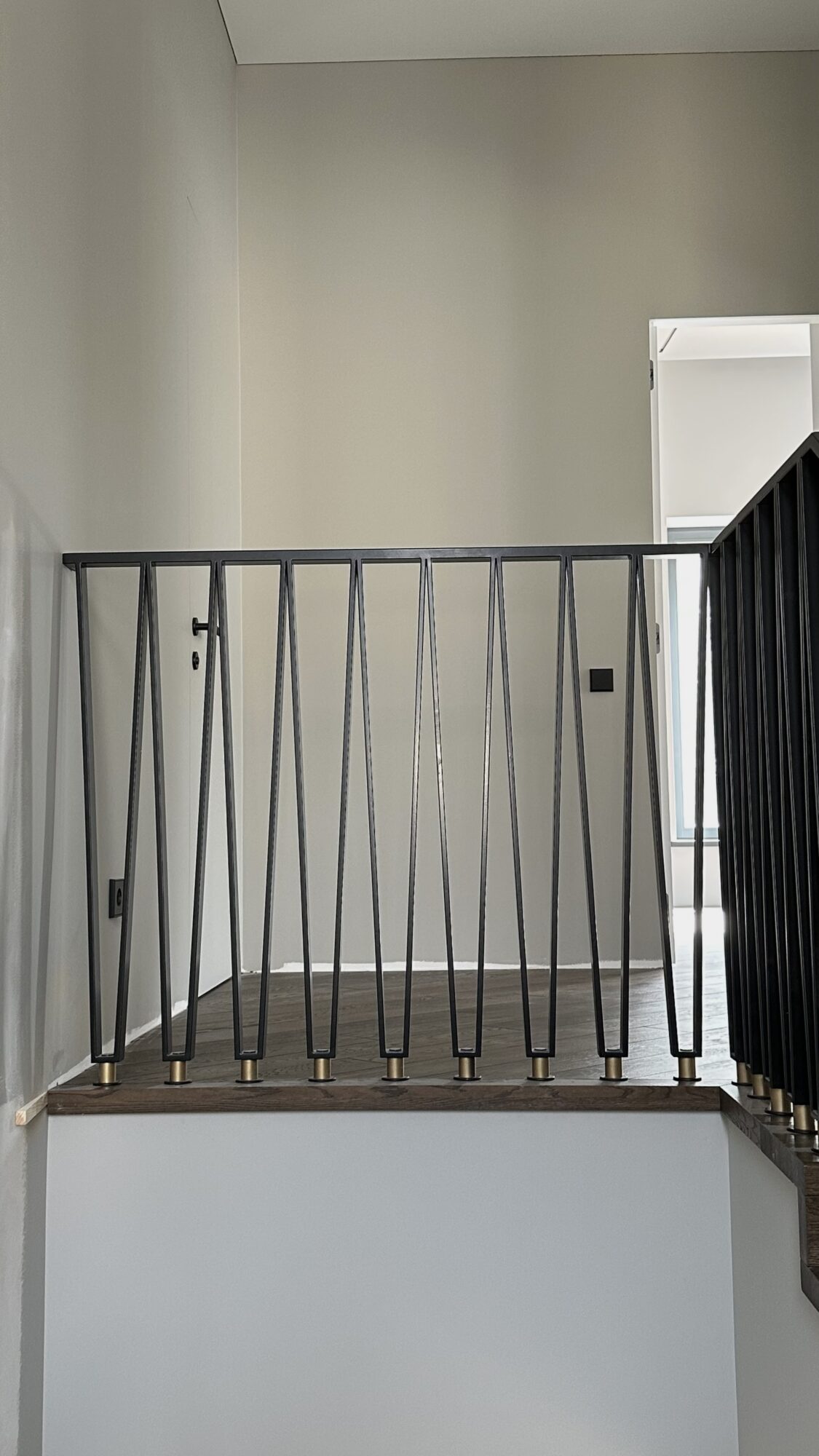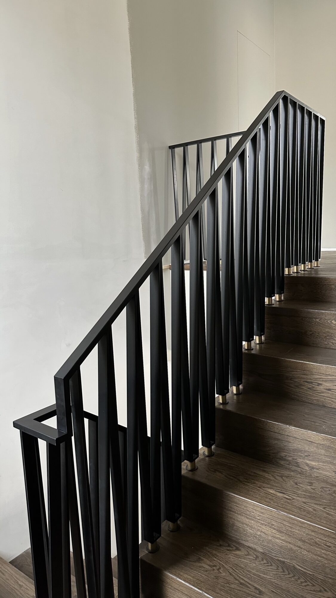 Vidaus turėklai su aukso elementais. Vienas išskirtinių mūsų projektų. Užduotis buvo pagaminti laiptų turėklus iš stačiakampio profilio ir nestandartinių formų. Užsakovui pasiūlėme būtent 40×10 mm metalo vamzdį su apvaliomis tekintomis detalėmis apačioje. Turėklus dažėme du kartus, kad išgauti dvi spalvas.