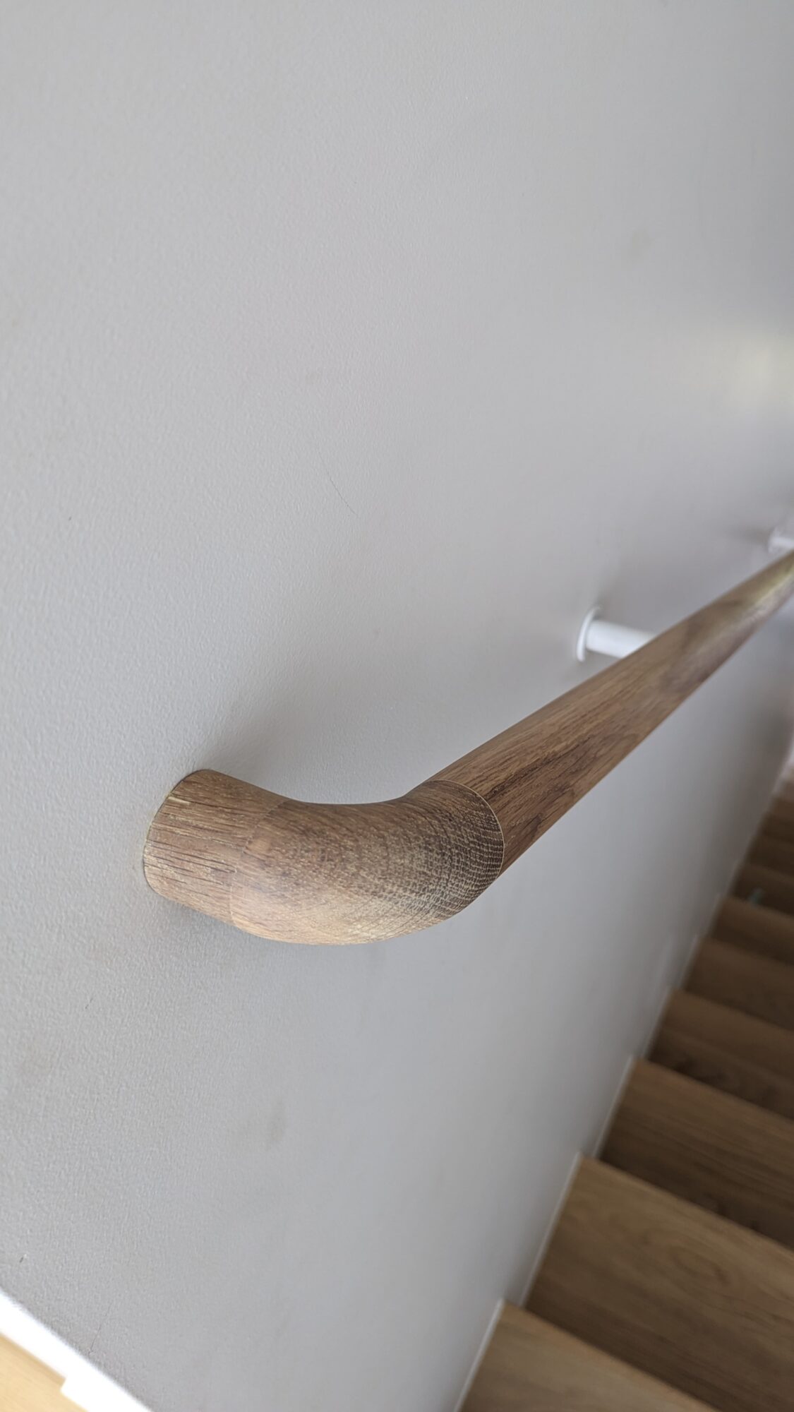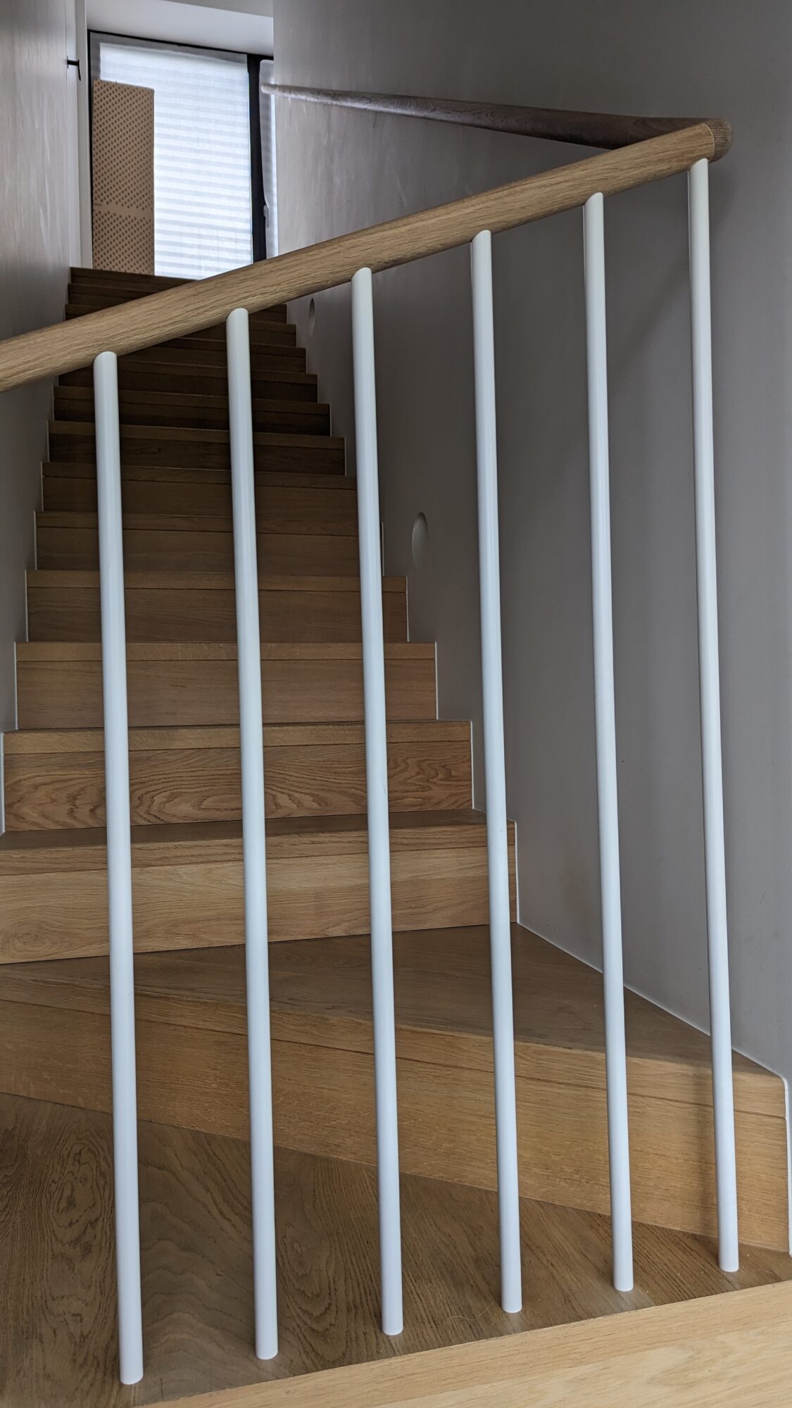 Kolegos atliko laiptų gamybą, o turėklus gaminome mes. Šiame projekto visur naudojome apvalius profilius. Turėklo detalė – porankio sieninis laikiklis pagal užsakymą gamintas būtent apvalus, prisiderinant prie namų ir turėklų dizaino.