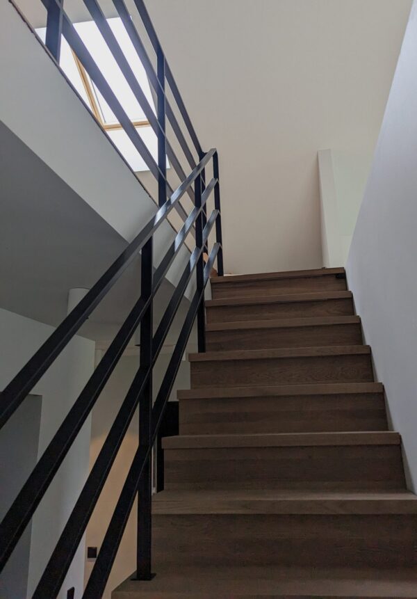 Metaliniai turėklai iš stačiakampių profilių. Įgyvendinome klientės ir dizainerės užduotį, pagaminti turėklus su horizontaliu užpildymu, taip suteikiant jiems išskirtinumo. Panaudojome stačiakampius profilius, turėklus tvirtinome iš viršaus į pakopas ir grindis.