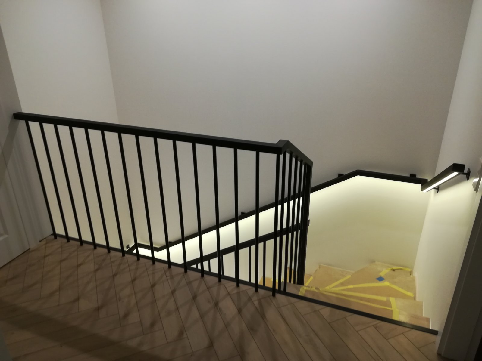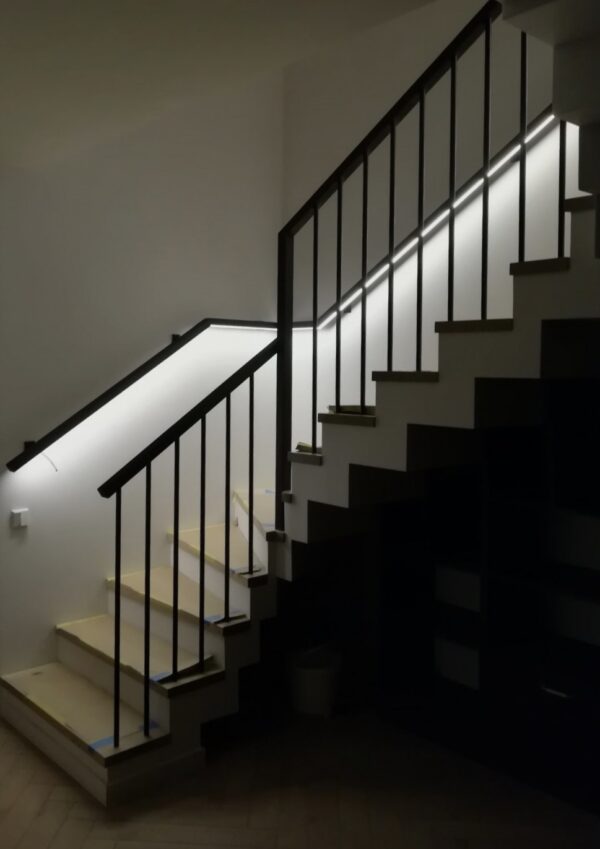 Mediniai turėklai padengti juoda matine spalva. Šiame projekte viską nudažėme juoda matine spalva. Papildoma į porankį sumontavome LED apšvietimą.