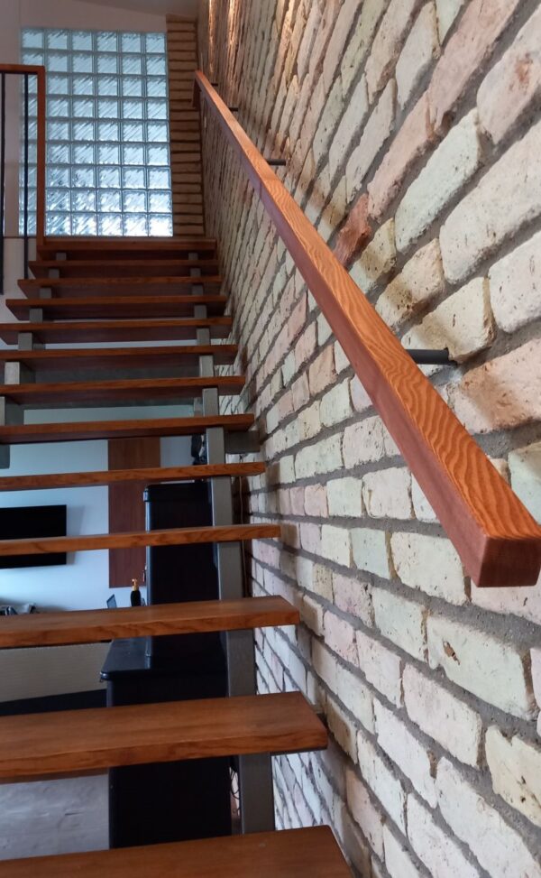 Uosio masyvo porankis prie sienos. Patogus porankio aukštis prie sienos yra 900 mm. Šiame projekte pasiūlėme kvadratinį medinį profilį 43×43 mm.