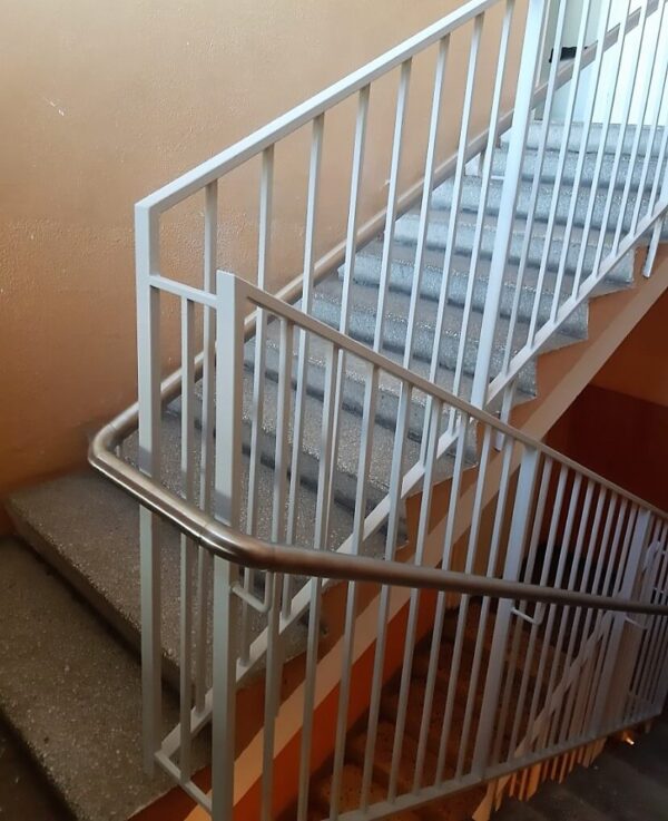 Turėklai mokymo įstaigai iš dažyto metalo. Turėklų konstrukcijos aukštis ir tarpai tarp vamzdelių atitinka visus keliamus reikalavimus. Montuojant mokyklos turėklus prie laiptų šono palengviname laiptų valymą.