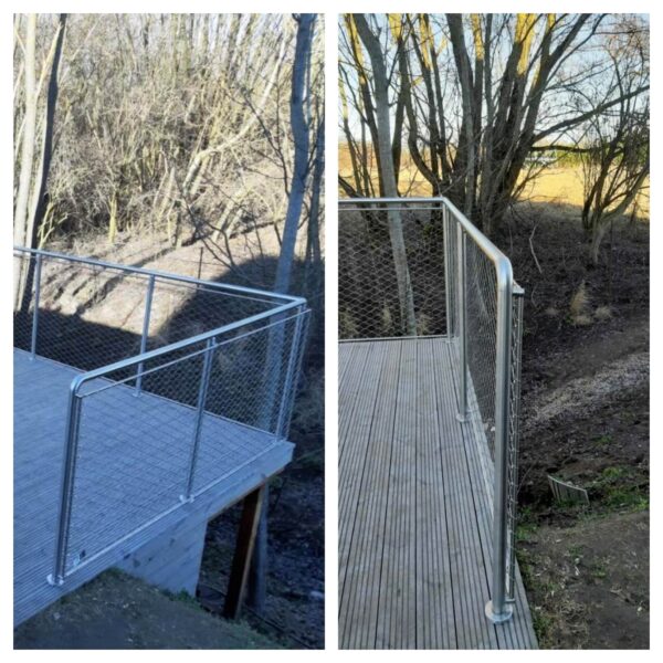 Terasos turėklas iš trosinio tinklo. Tinklas pagamintas iš nerūdijančio plieno, konstrukcija yra labai saugi tinka viešoms įstaigoms.
