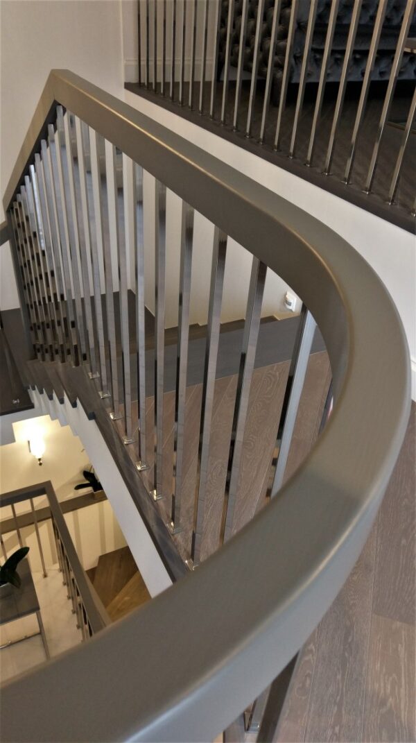 Nerūdijančio plieno vidaus turėklai su veidrodiniu šlifavimu. Šių turėklų išskirtinumas vamzdelių šlifavimas. Kiekvieno vamzdelio apačioje sumontuota dekoratyvinė detalė. Porankio spalva priderinta prie spintelių spalvos.