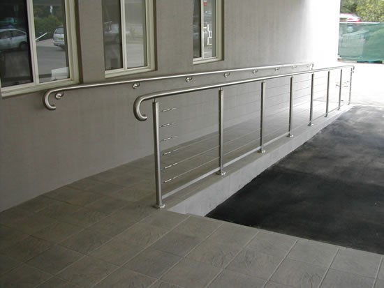 Neįgaliųjų nerūdijančio plieno turėklas su horizontaliu užpildu. Porankio galą suapvalinome ir vidinė turėklų dalį horizontaliai užpildėme – taip padidindami turėklų saugumą.