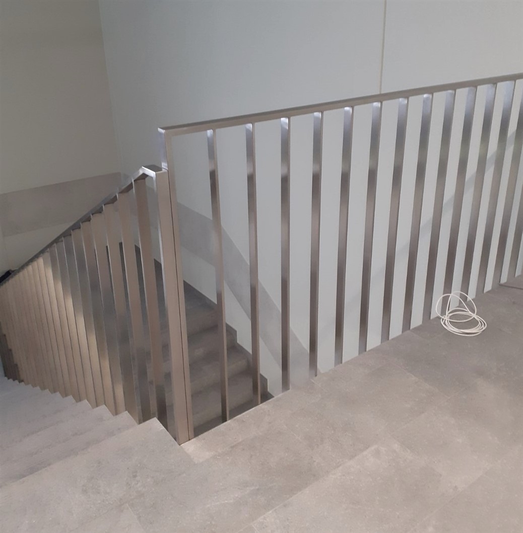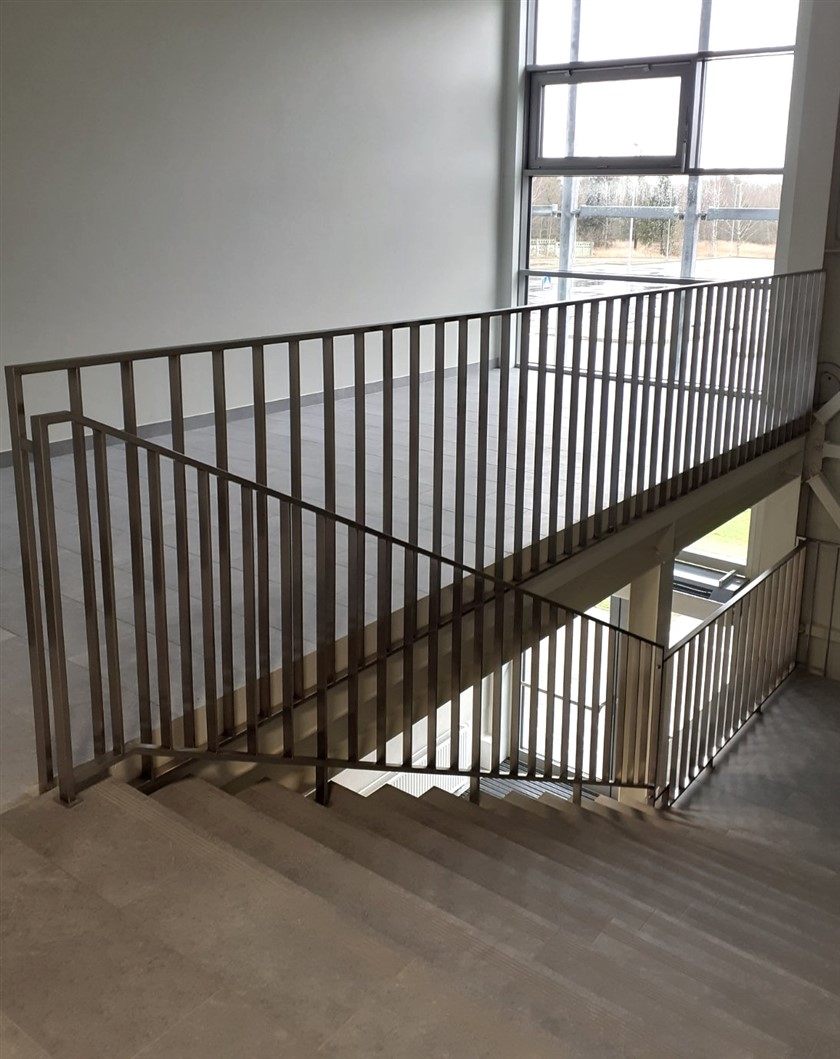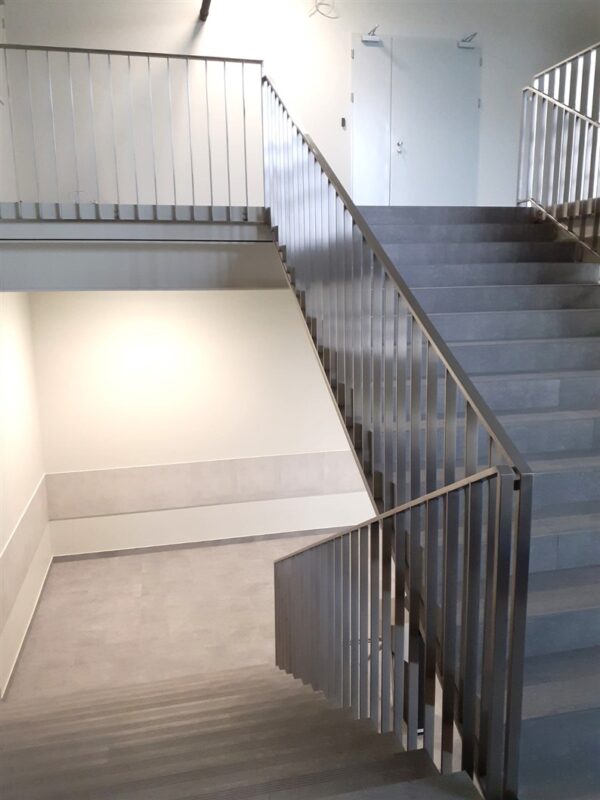Nerūdijančio plieno turėklai iš stačiakampių profilių. Konstrukcija yra saugi ir atitinka visus STR keliamus reikalavimus vidaus turėklams.