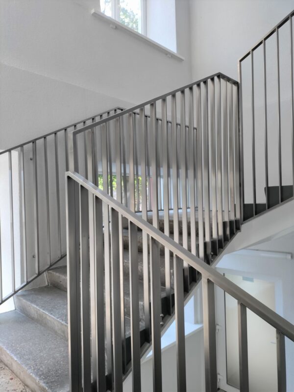 Mokyklos turėklai iš nerūdijančio plieno. Visa konstrukcija pagaminta iš stačiakampių nerūdijančio plieno profilių. Turėklai buvo montuojami prie laiptų šono išsaugant jų plotą ir palengvinant valymą.