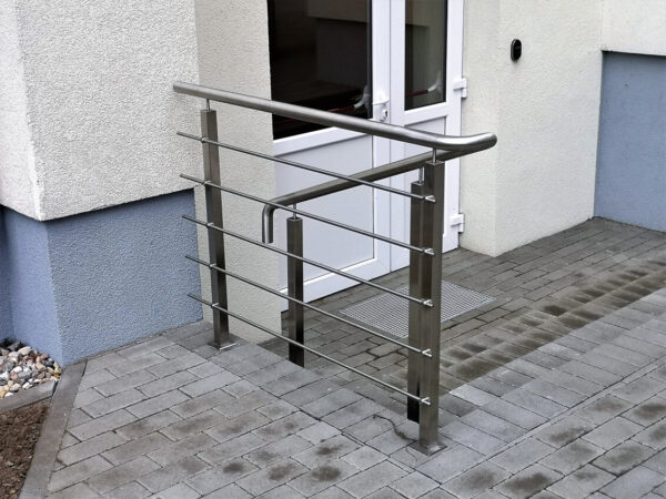 Nerūdijančio plieno turėklai su horizontaliu užpildu. Šiame projekte užpildui panaudojome penkis apvalius strypus, taip suteikiant papildomą apsaugą. Tokio tipo turėklams suvirinti naudojame TIG suvirinimo aparatą.