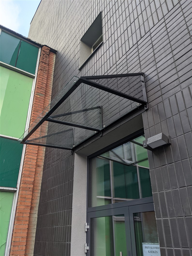 Stogelis virš durų pagamintas iš juodo plieno. Viršutinė dalis grūdintas 10 mm stiklas, šonuose įvirintas tinklas. Konstrukcija gruntuojama ir dažoma pagal RAL spalvų paletę.