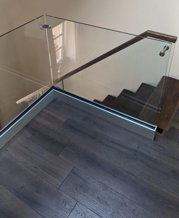 Vidaus turėklai su Q-railing stiklą laikančių profiliu. Antrame aukšte nebuvo galimybės stiklo turėklų tvirtinti į perdango šoną, todėl klientui pasiūlėme Q-railing stiklo tvirtinimo sistemą iš viršaus. Ant laiptų maršo stiklo papildomai sumontavome uosio masyvo medinį porankį.