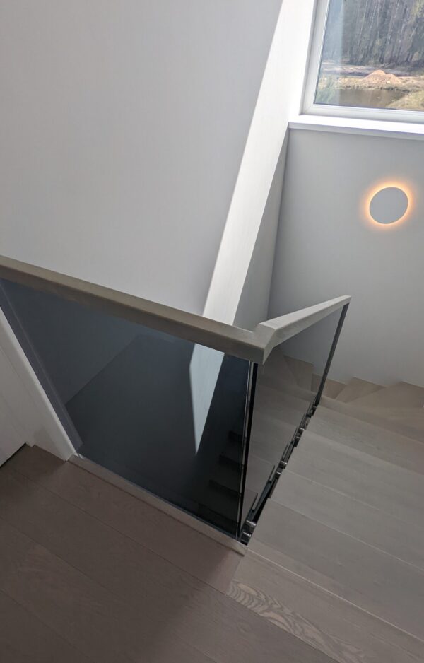 Pilko stiklo berėmiai turėklai su mediniu porankiu. Stiklo turėklų aukštis H950 mm, visus turėklų matmenis deriname su užsakovu. Porankis uosio masyvo, padengtas užsakovo nurodyta alyva.