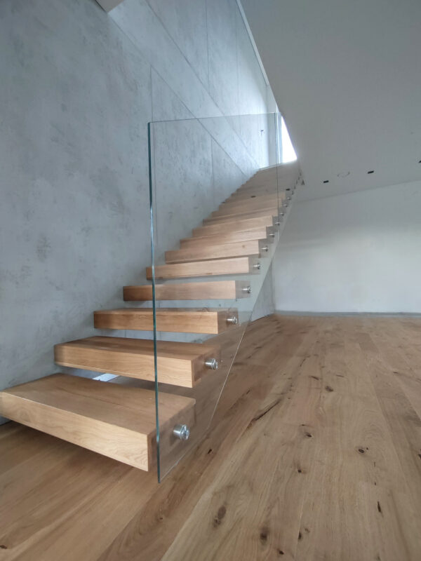 Berėmio stiklo turėklai ant kabančių laiptų. Klientas ir dizainerė pageidavo lengvo laiptų turėklų konstrukcijos, todėl pasiūlėme būtent stiklą be medinio porankio. Stiklas 10 mm grūdintas skaidrus, tvirtinimas šoninis su turėklų elementais iš nerūdijančio plieno.