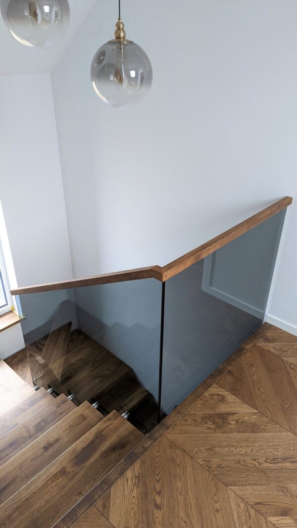 Stiklo turėklai su pilku grūdintu stiklu. Stiklo konstrukciją tvirtinome į medines laiptų pakopas. Pakopas papildomai sutvirtinome į sieną, kad stiklo konstrukcijos laužimą sumažinti kitoms turėklų tvirtinimo detalėmes. Porankis ąžuolo masyvo padengtas beicu.
