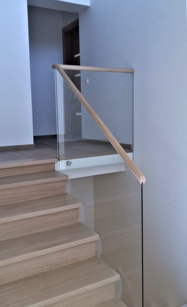 Skaidraus stiklo turėklai su porankiu. Stiklo turėklai pritvirtinti prie laiptų šono su turėklų tvirtinimo detalėmis iš nerūdijančio plieno. Turėklų tvirtinimo elementus galime dažyti ir kita Jūsų pageidaujama spalva.